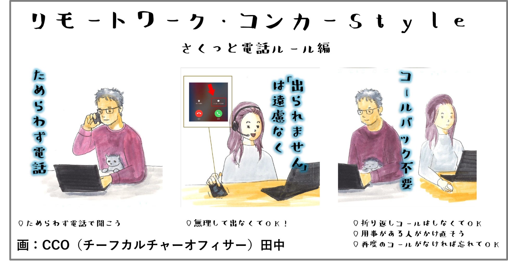 リモートワークが原因で起こるミスコミュニケーションやすれ違いを防ぎ、スムーズに業務を行うため、リモートワーク下でのルールやマナーのイラストを社員が作成、社内周知しています。